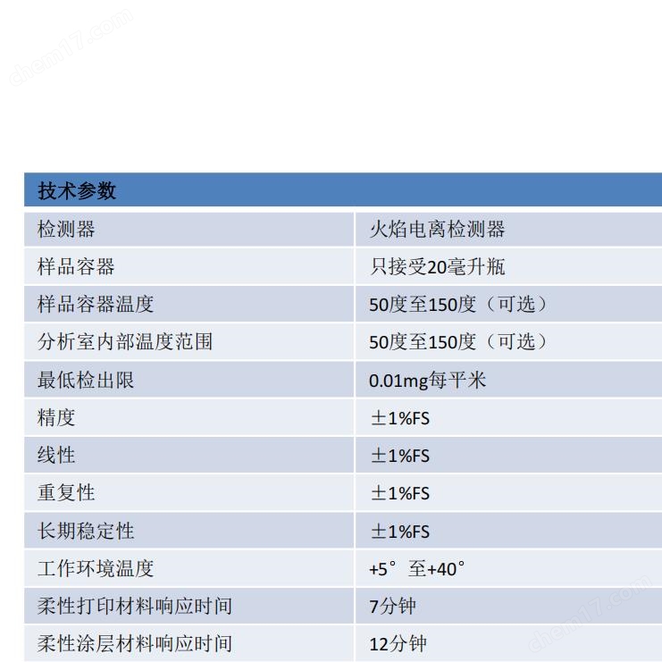 NIRA >這個儀器設(shè)備是組裝在一個金屬盒體內(nèi)的, 它可以放在桌子上,或者距離印刷機數(shù)米的工作臺上(需要的外部配套有電源,壓縮空氣,以及供應(yīng)氣相色譜儀的超純氫氣和超純空氣)儀器有以下部分組成: 毛細色譜柱50米乘以0.53 打印機 50個樣本容器(瓶)的成套設(shè)備 配件: 精密切割的100平方厘米樣本 樣品容器附加工具 用于校準(zhǔn)的標(biāo)準(zhǔn)物質(zhì) 標(biāo)準(zhǔn)物質(zhì)進樣器(5μl) 可選配件: 空氣凈化器